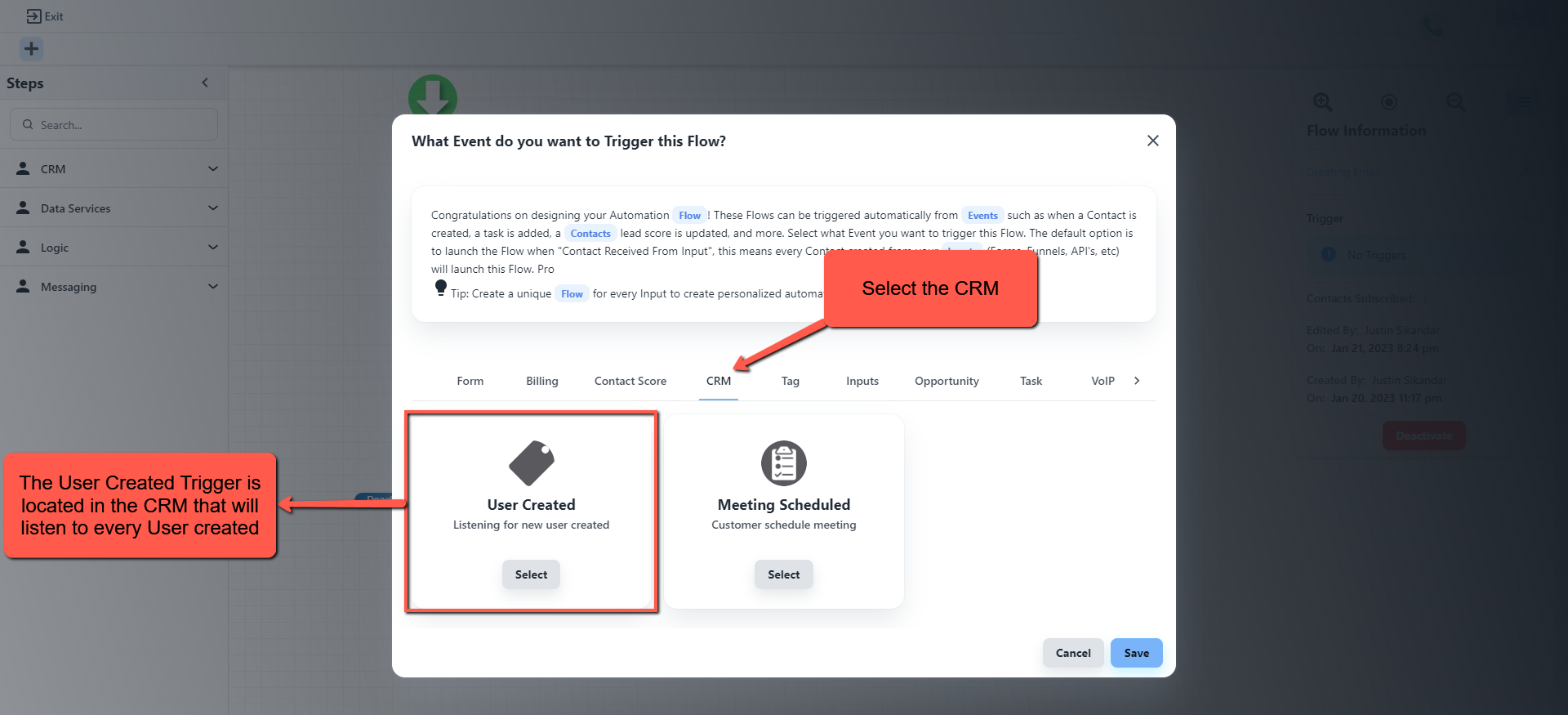 The User Created Trigger is present inside the CRM that listen to any new User created. When a certain User is created the Trigger gets Triggered and a certain task can be performed by the Automation Flow. In this case the Flow sends a Greeting email automatically when a certain User is created.