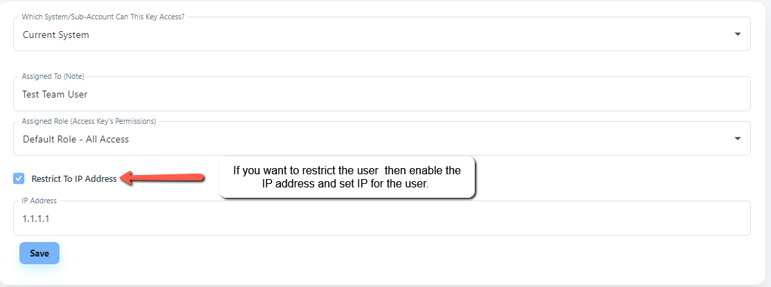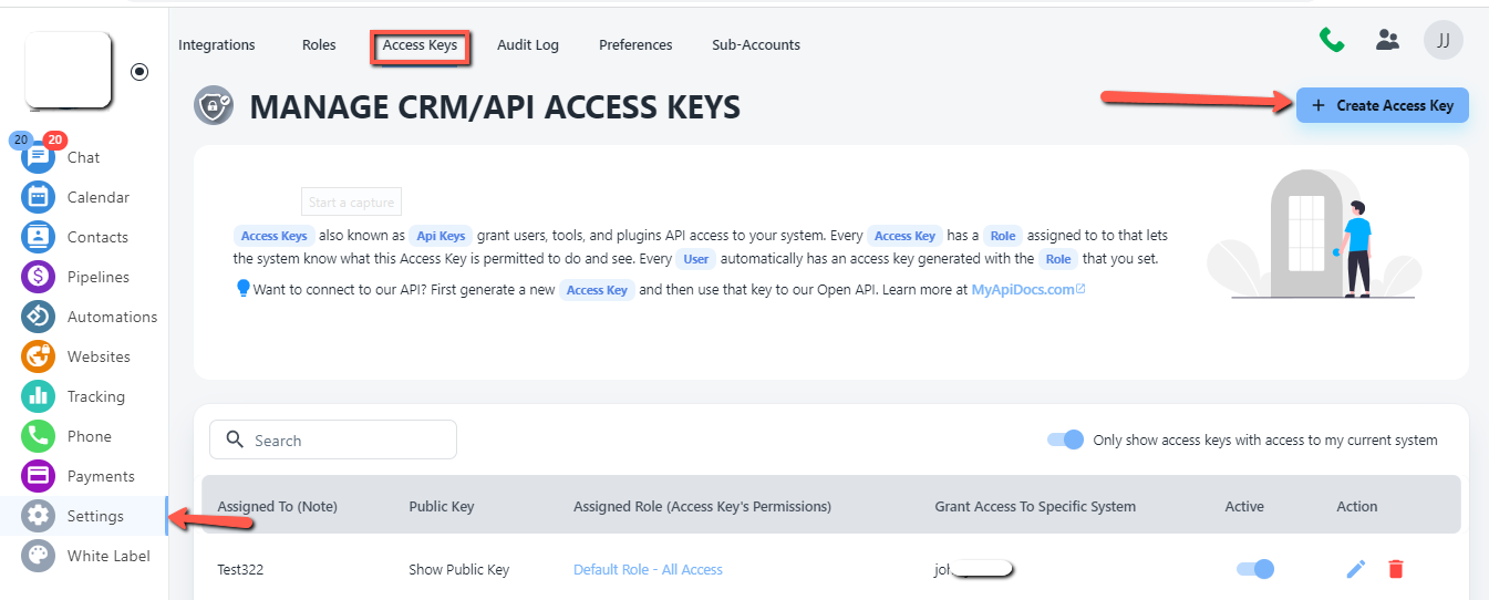 Creating and sharing an Access Key will provide another user access to your CRM. Only share Access Keys with authorized individuals. Our Terms of Service, Acceptable Use Policy, and Privacy Policy govern the use of all users and use of all Access Keys