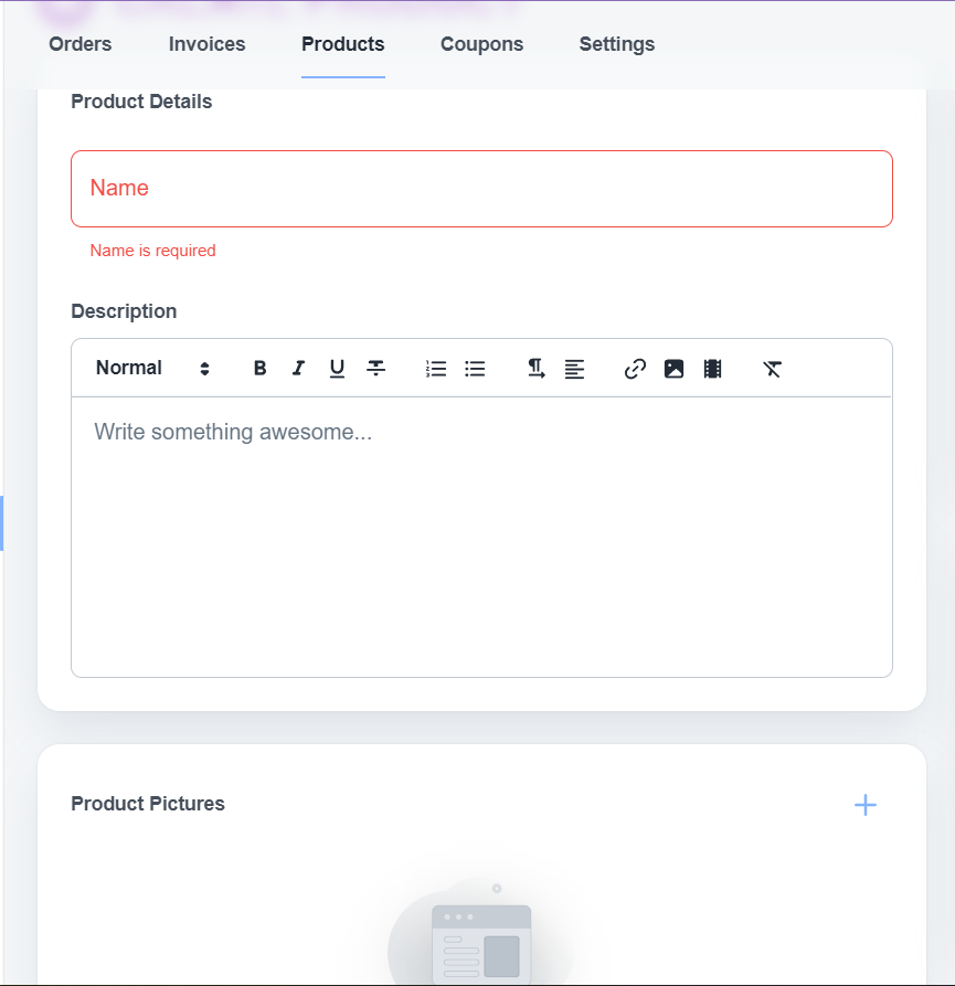 Navigate to the product builder by clicking the “Payments” on the left side menu. Then when you have the database page open you will see a link to “Products” on the top of your page, please click that.