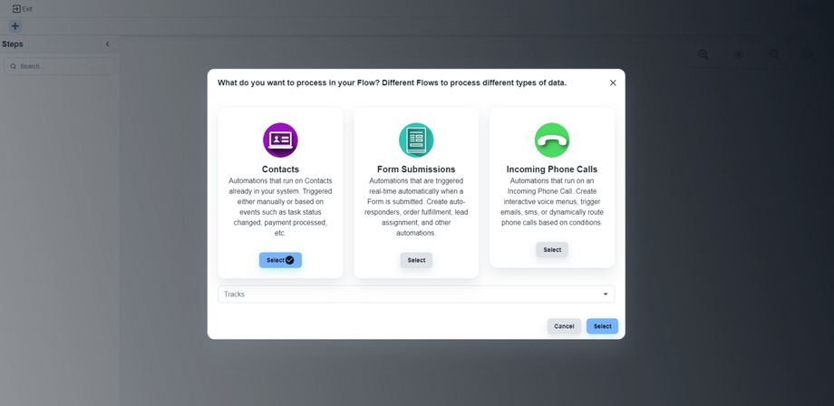 When you start building a flow, the system allows you to select the type of data that you want to process.